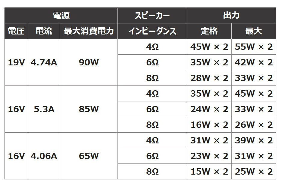 次の表はメーカー動作保証外にはなりますが、16V-4.06A(65W)から19V-4.74A(90W)の電源を使用した場合におけるスピーカー出力特性の理論値です。計算方法は割愛しますが、メーカー公表値を参考に算出しています。