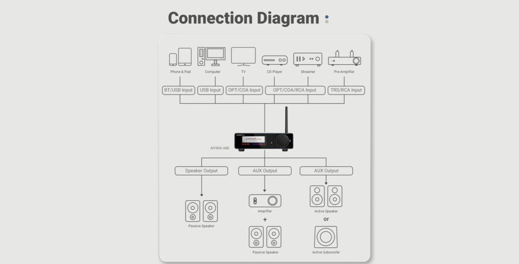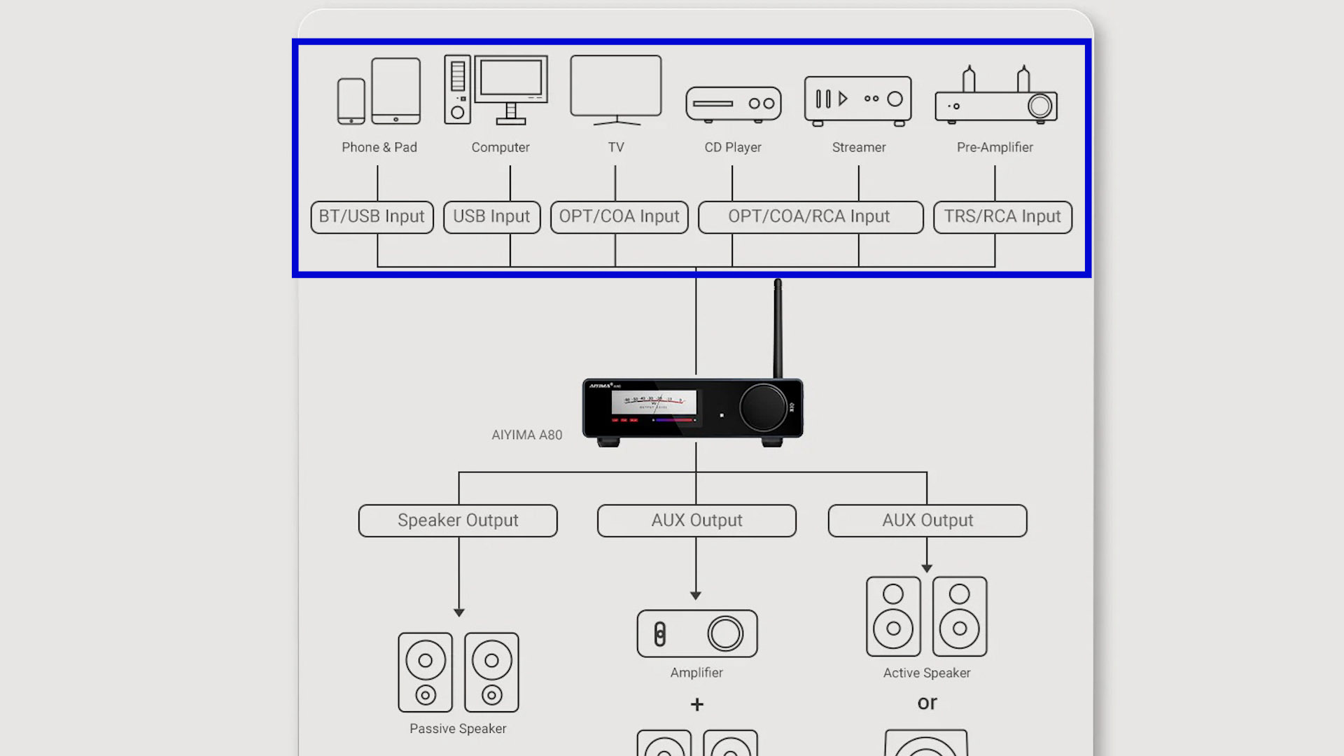 入力元のソースにアンプが内臓されていて十分な出力ゲインがある状態でA80にインプットできている場合は問題ありませんが、USB/Bluetooth/OPTのデジタル信号の場合ソース元で出力を最大にしても信号の増幅が足りずA80で音量を上げる必要がありますので、その手前で増幅させてからA80にインプットさせるというものです。