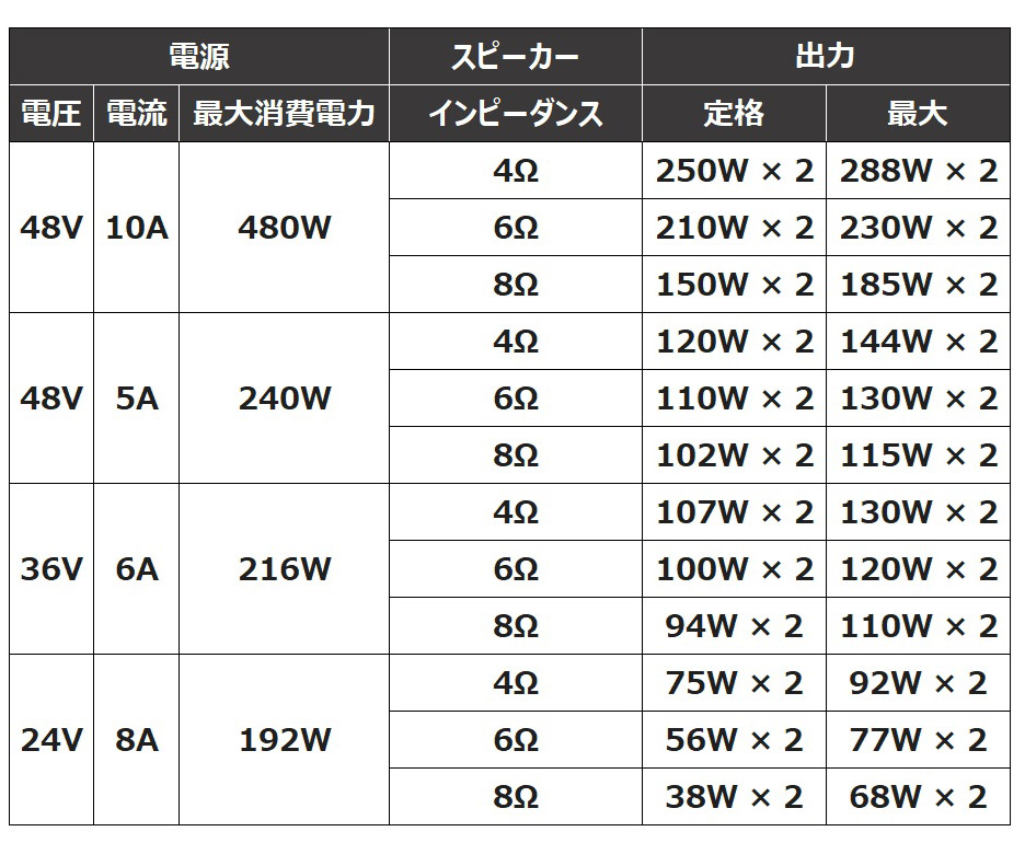 先ずは発熱問題の対応です。下表はAIYIMA A80の公式サイトに掲載されているACアダプターとスピーカー出力特性の仕様表で、最小24V8Aから最大48V10Aまでが推奨電源となっています。